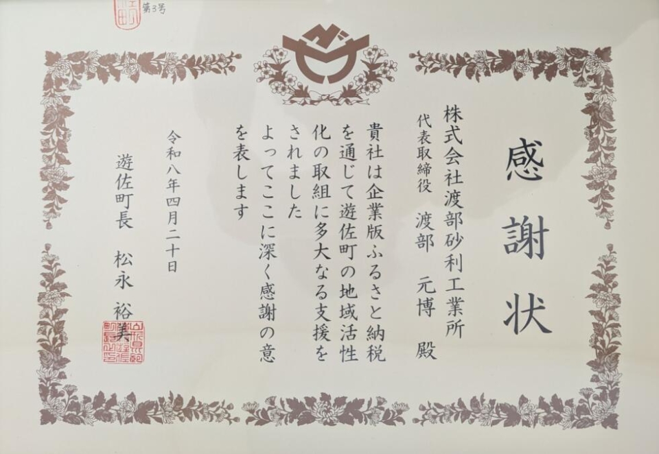 この度、≪企業版ふるさと納税(地方創生応援税制≫を通じ遊佐町へ寄附をさせていただき、それに伴い、大変光栄な感謝状を拝受いたしました。